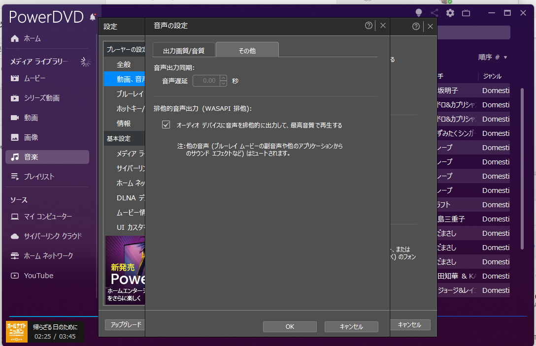 そこでふと、「音質ってどれくらい違うんだろう?」と設定をいじっていて、「WASAPI排他モード」というものを使ってみました。