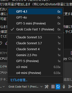 Microsoft Visual Studio Codeで、「Grok Code Fast 1」が使えるようになっている。