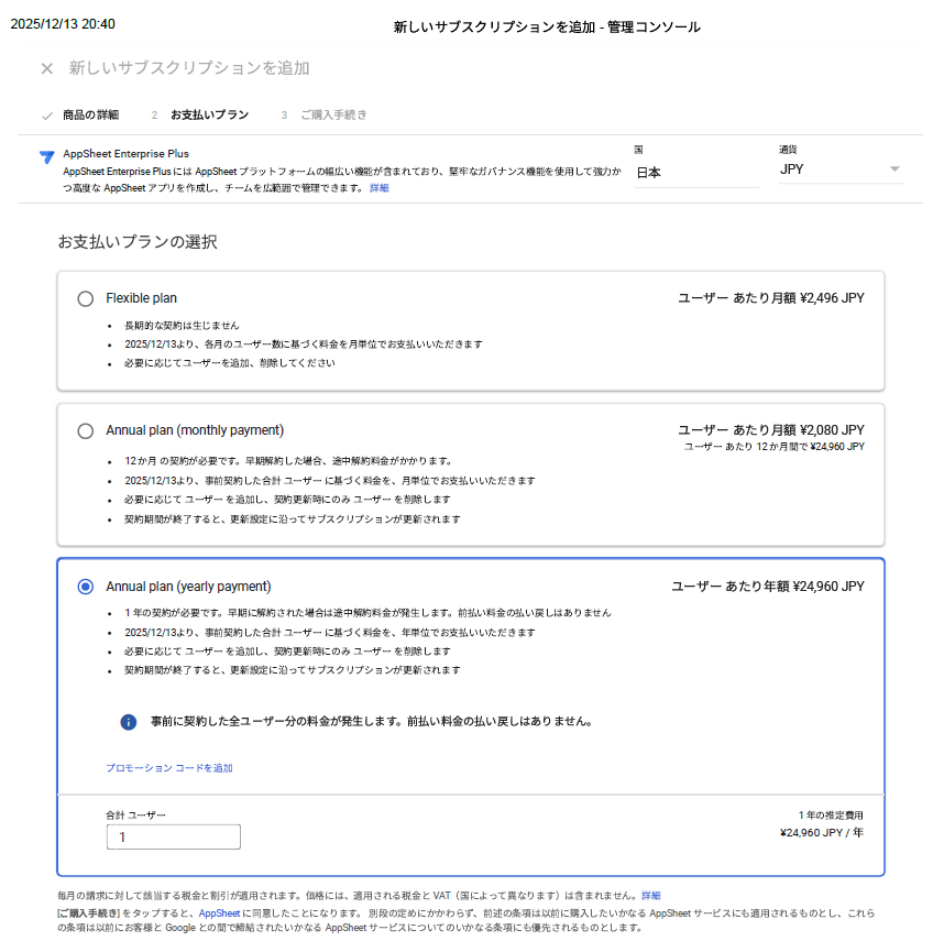 結局、AppSheet Enterprise Plusを年間契約(年額\24,960JPY/ユーザー)で購入することに。