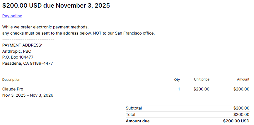 そして極めつけは、Claude Proの年間サブスクリプション。前払いで200ドル支払いました。