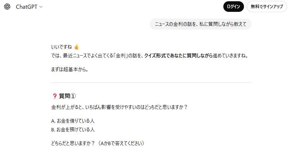 「ニュースの金利の話を、私に質問しながら教えて」