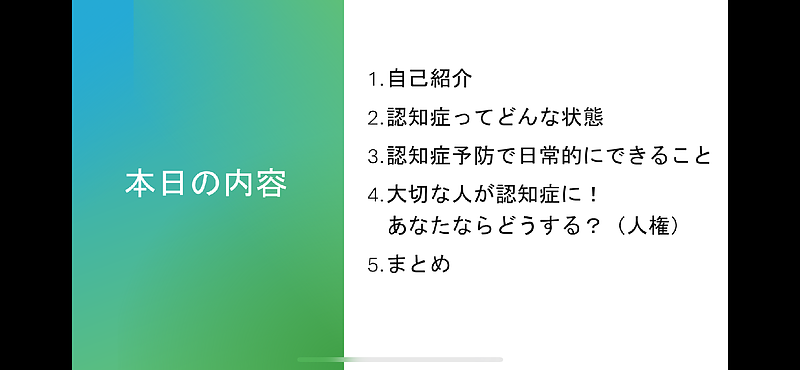 テーマは「脳を活性化して活き活きした人生を」でした。私の中では今回のテーマは薬剤師としてもそうですが、新しいチャレンジでした。最近は講演内容のすり合わせをした際に、要望を伺い受講生の年齢層を聞いて作成しています。