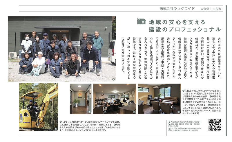 由布市を拠点に、土木工事や災害復旧工事に取り組む一方で、県建設産業女性活躍推進事業「BLOCKS」や、大阪万博「NO BORDERS」にも参加。女性が働きやすい環境整備や若手技術者の育成にも尽力。