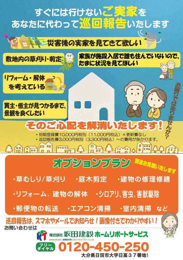 庭の草木が伸びお隣さんに迷惑をかけていないか、そんな心配をされている方も多いと思います、そういう方のために空家を巡回し文章、画像等で報告するサービスです。