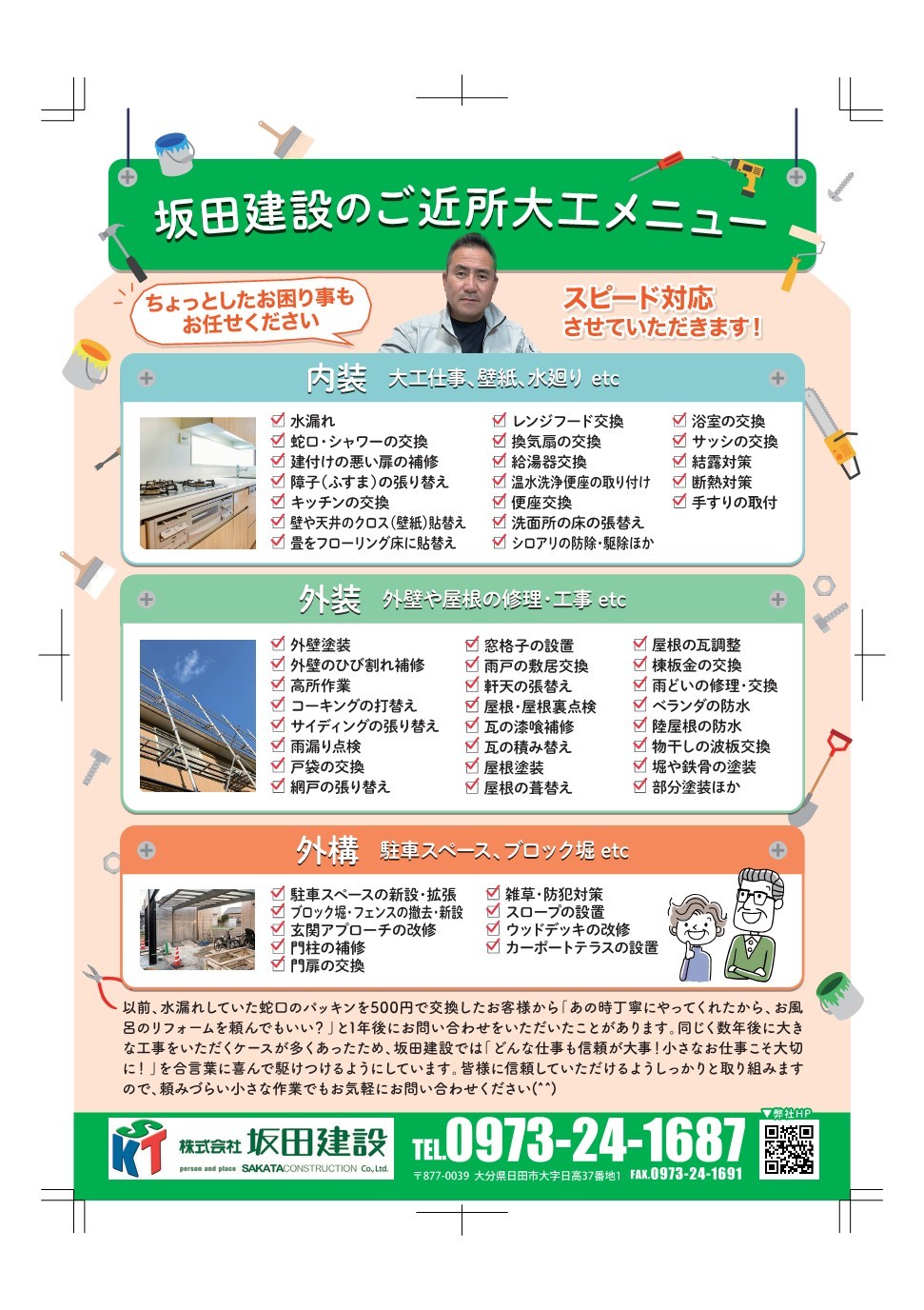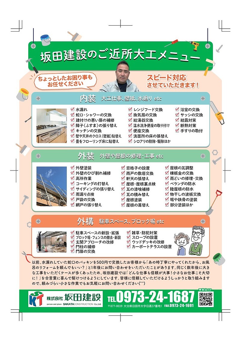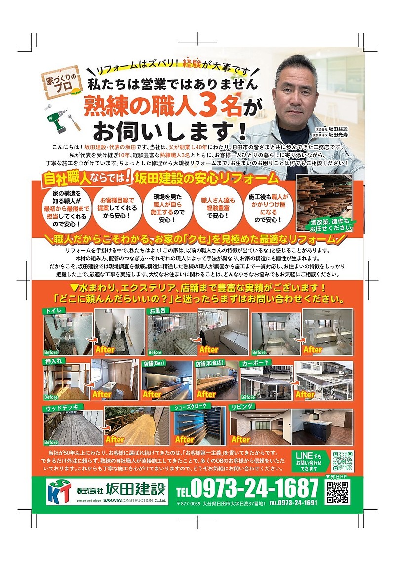 4月号にリフォーム用のチラシを作り、配布を依頼したところ、大きな反響を頂き有難いことにてんてこ舞いしております、お家の事でどこに頼んでよいかわからず困っている方がたくさんいることを知りました、自分の得意分野で人助けが出来れば幸いです、今後とも親身になって精進してまいります。