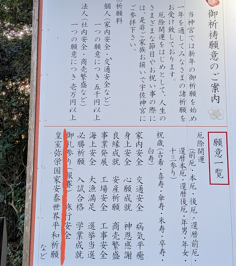 願意一覧の中に「皇室弥栄国家安泰世界平和祈願」