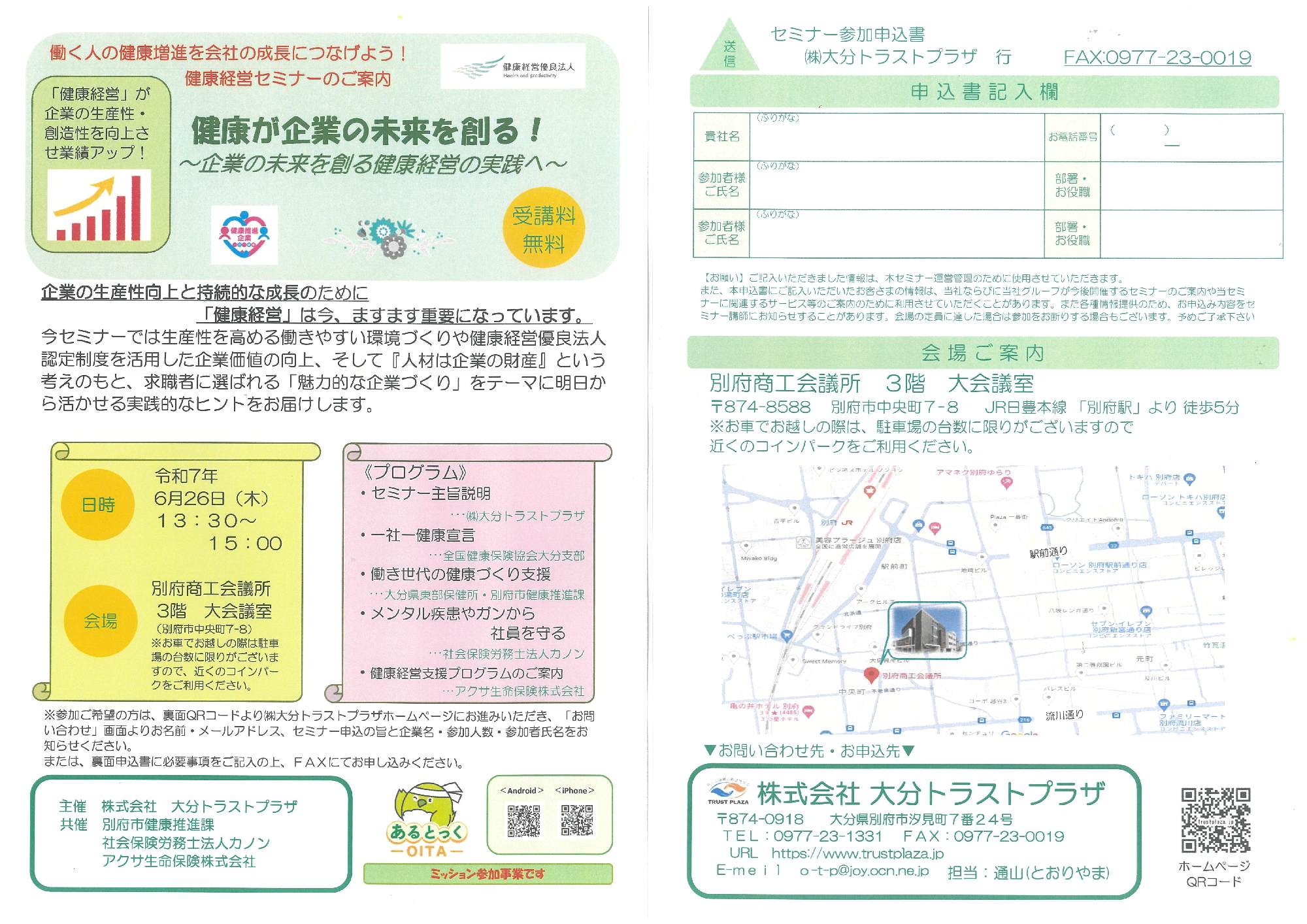 今回のセミナーでは生産性を高める働きやすい環境づくりや健康経営優良法人認定制度を活用した企業価値の向上、そして『人材は企業の財産』という考えのもと、求職者に選ばれる「魅力的な企業づくり」をテーマに明日から活かせる実践的なヒントをお届けします。日時 2025年6月26日(木)13時30分~15時00分 参加費無料 場所 別府商工会議所 お申込み方法 ホームページお問合せ画面よりお申込み下さい。