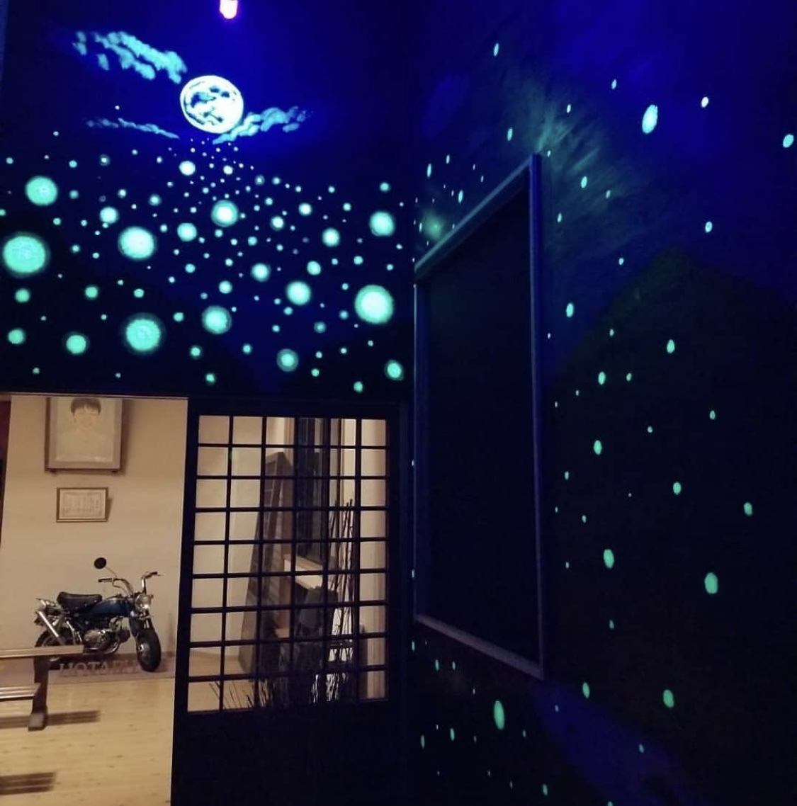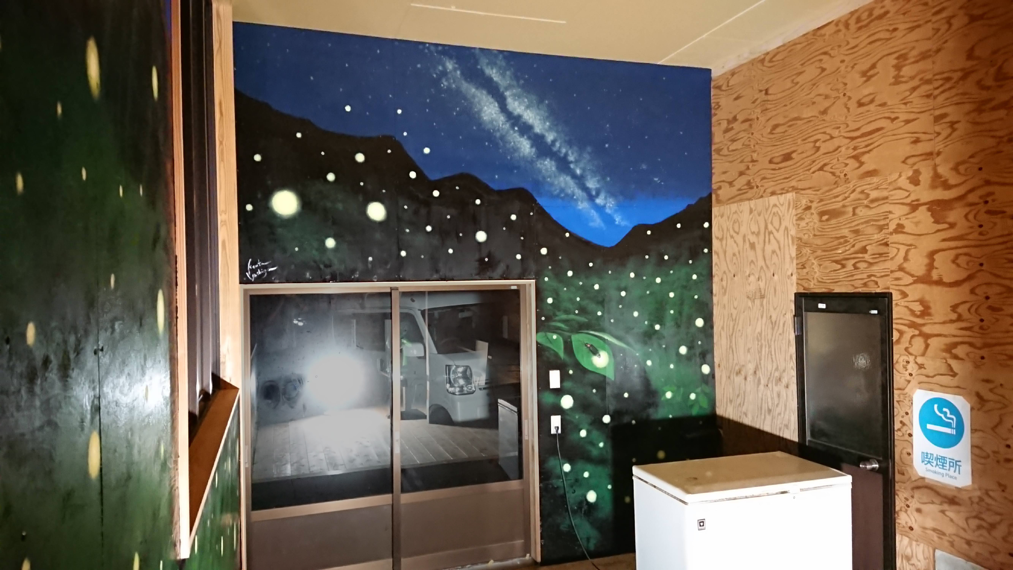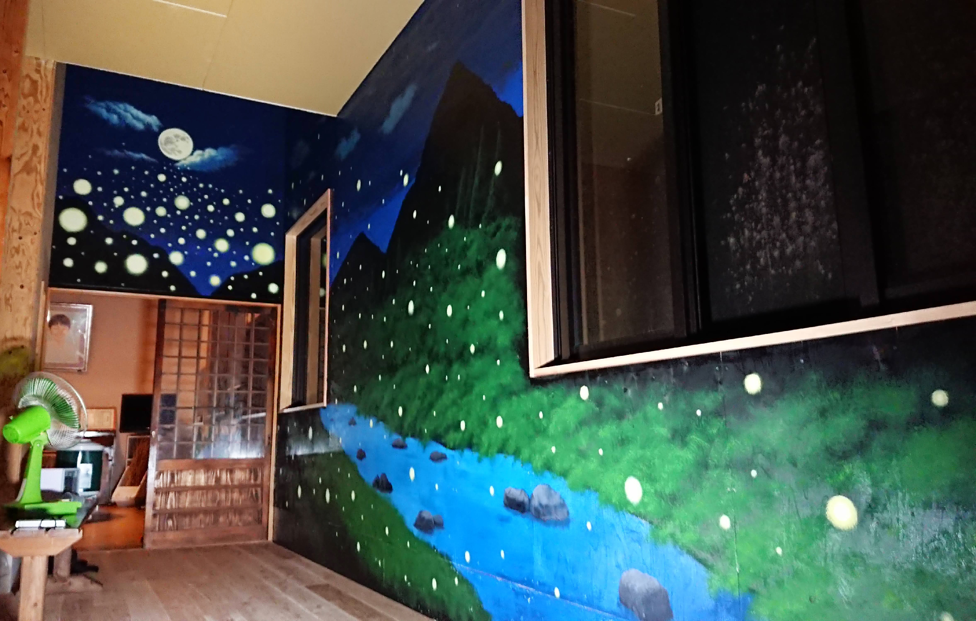 自然豊かな耶馬溪には、たくさんのホタルが現れ、オーナーさんもホタルを守る活動もされていて、そちらをPRする目的で、室内すべてに、そこから見える月とたくさんのホタルを描き、蛍光塗料でブラックライトを点灯すると光るという壁画を初めてさせて頂きました。