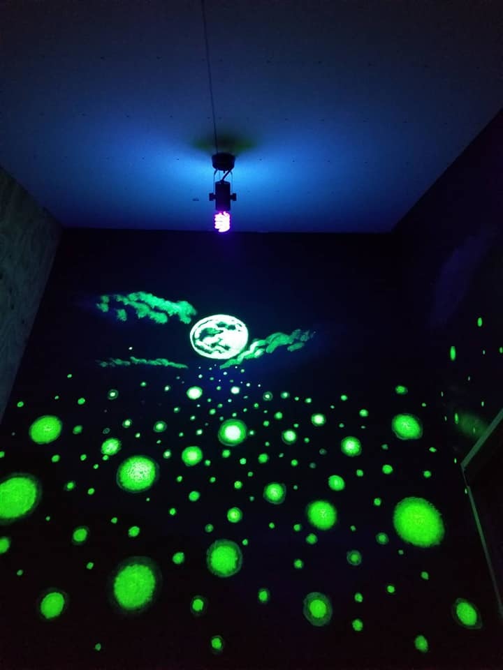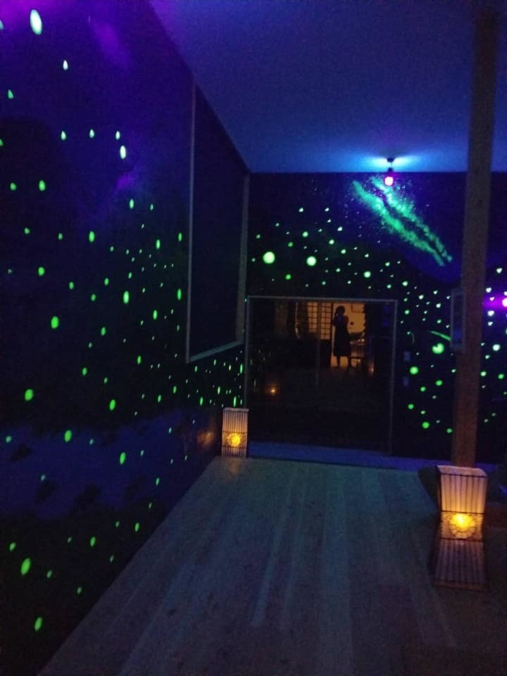今回ご紹介する作品は、2つとも1室丸ごと異空間に変化させ、そして暗闇で光る蛍光塗料を利用した作品になります。