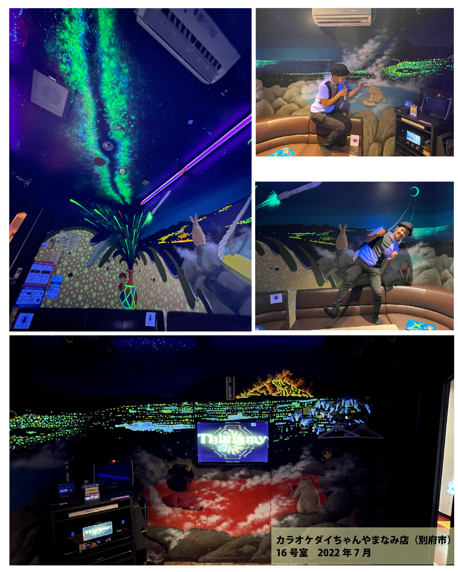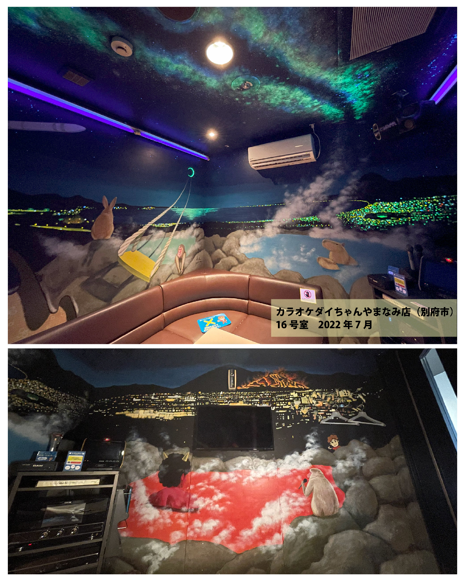 2つ目は、2022年に別府市にあるカラオケダイチャンやまなみ店を、アートでリニューアルという企画にて、16号室をまるまる描かせて頂きました。テーマは「夢の湯」。