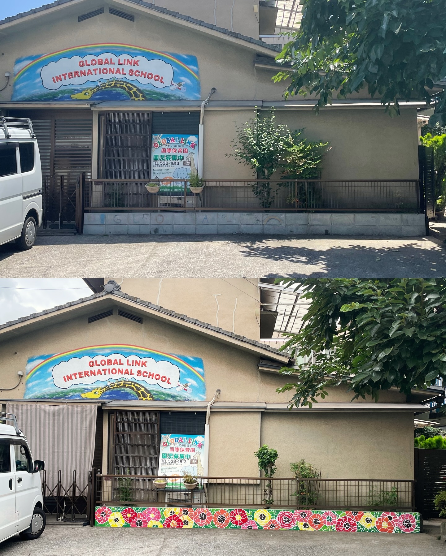 昨年、活動初期に制作させて頂いていた壁画を17年ぶりに壁画修復&追加制作をさせて頂いた、大分市中島にある英語の保育園『グローバルリンクインターナショナルスクール』さんに、今年も追加で壁画制作させて頂きました。