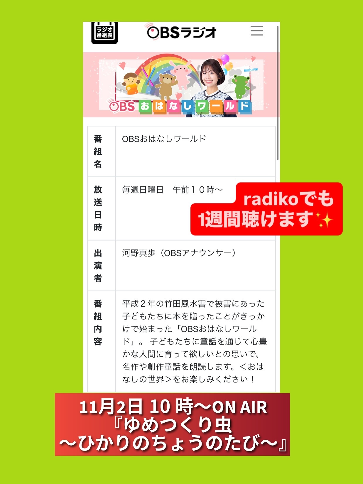 OBSラジオの絵本読み聞かせ番組『おはなしワールド』にて、新作のゆめつくり虫をご紹介頂きました!