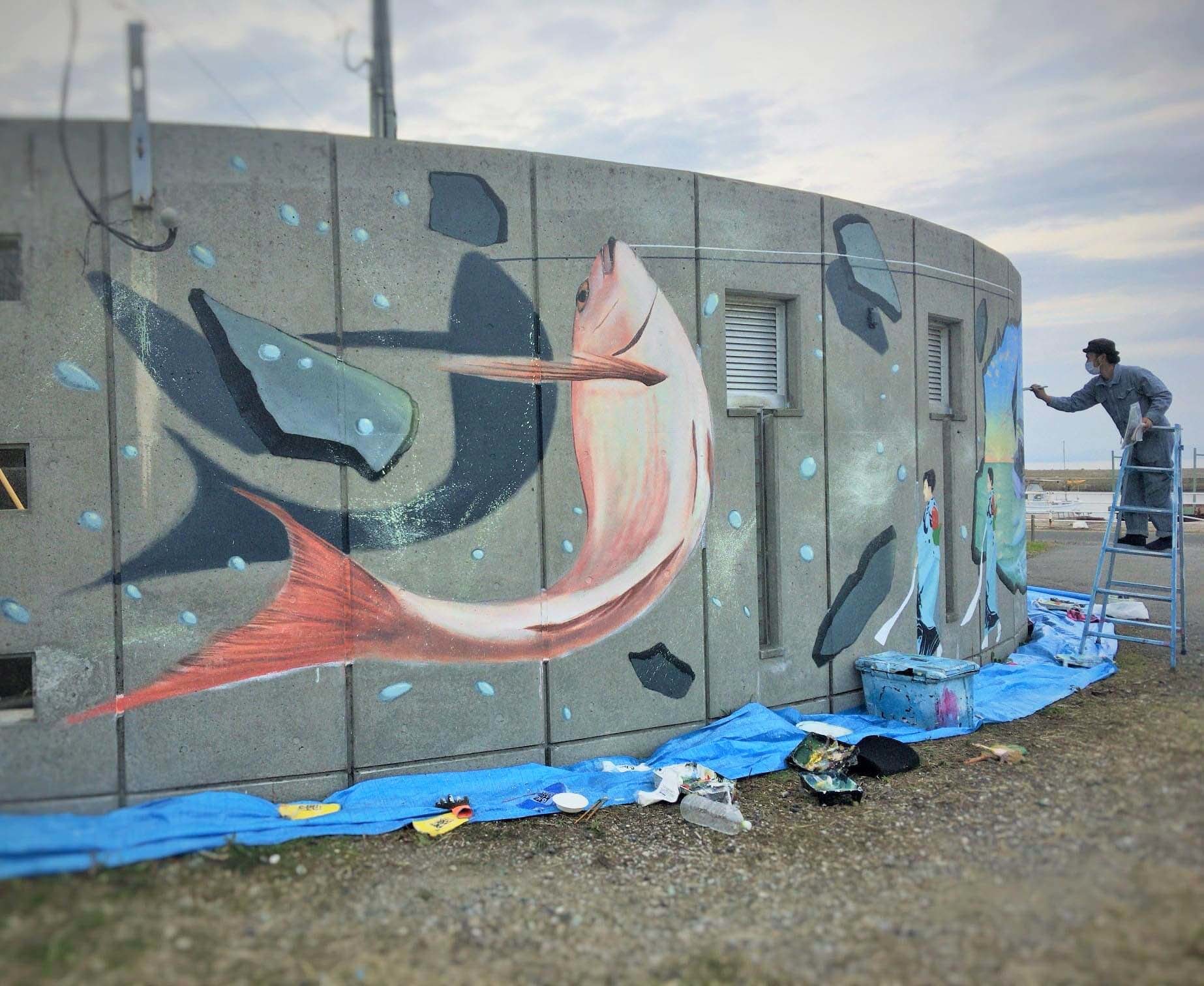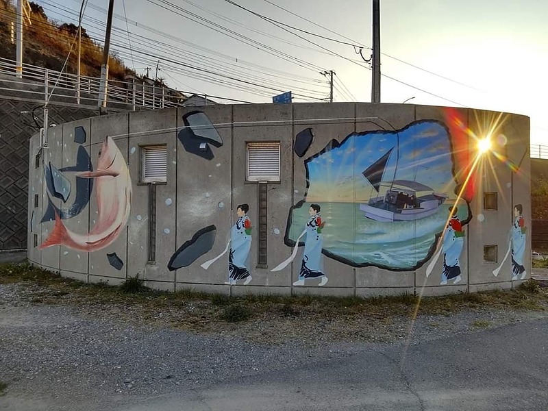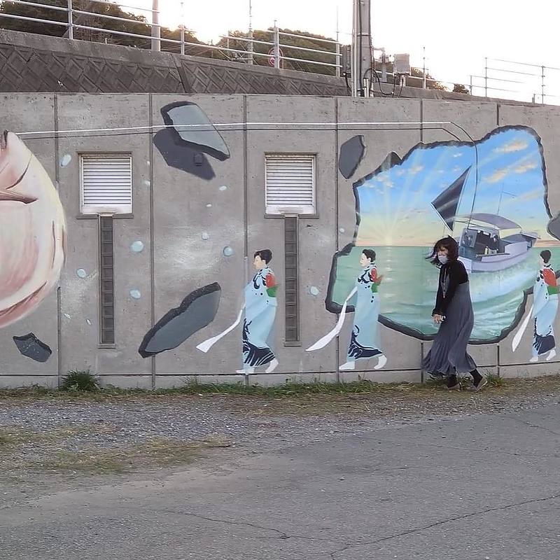 壁画は、コロナ禍に突入し、長年続いている地域のお祭り『関の鯛つりおどり大会』が中止となったことを聞き、それをテーマに、会場となっていた佐賀関市民センターの中にあるトイレの壁面に描かせて頂いたものです。