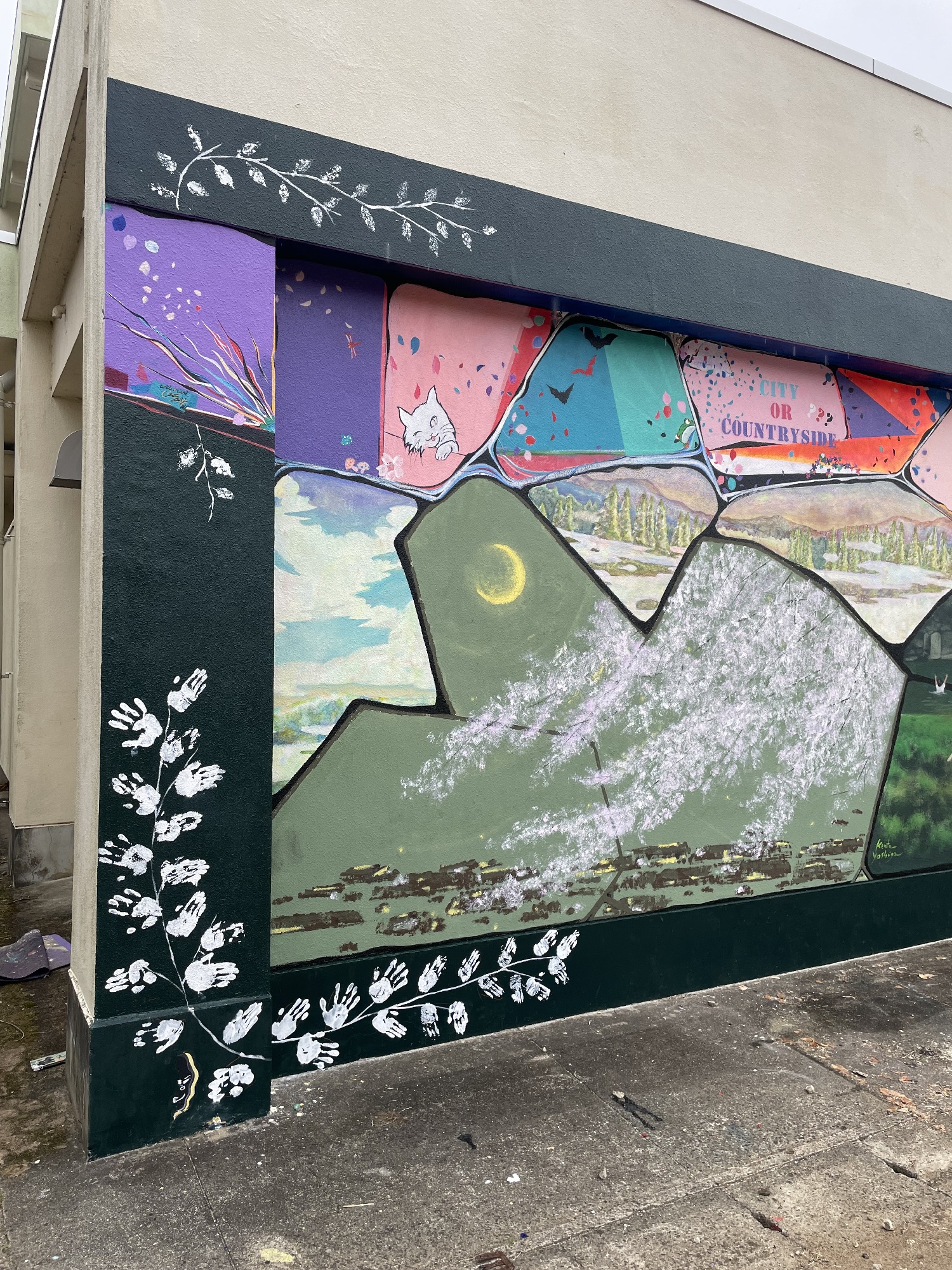 壁画の周りの額縁部分の模様を手形で彩って頂き、無事に完成となりました!