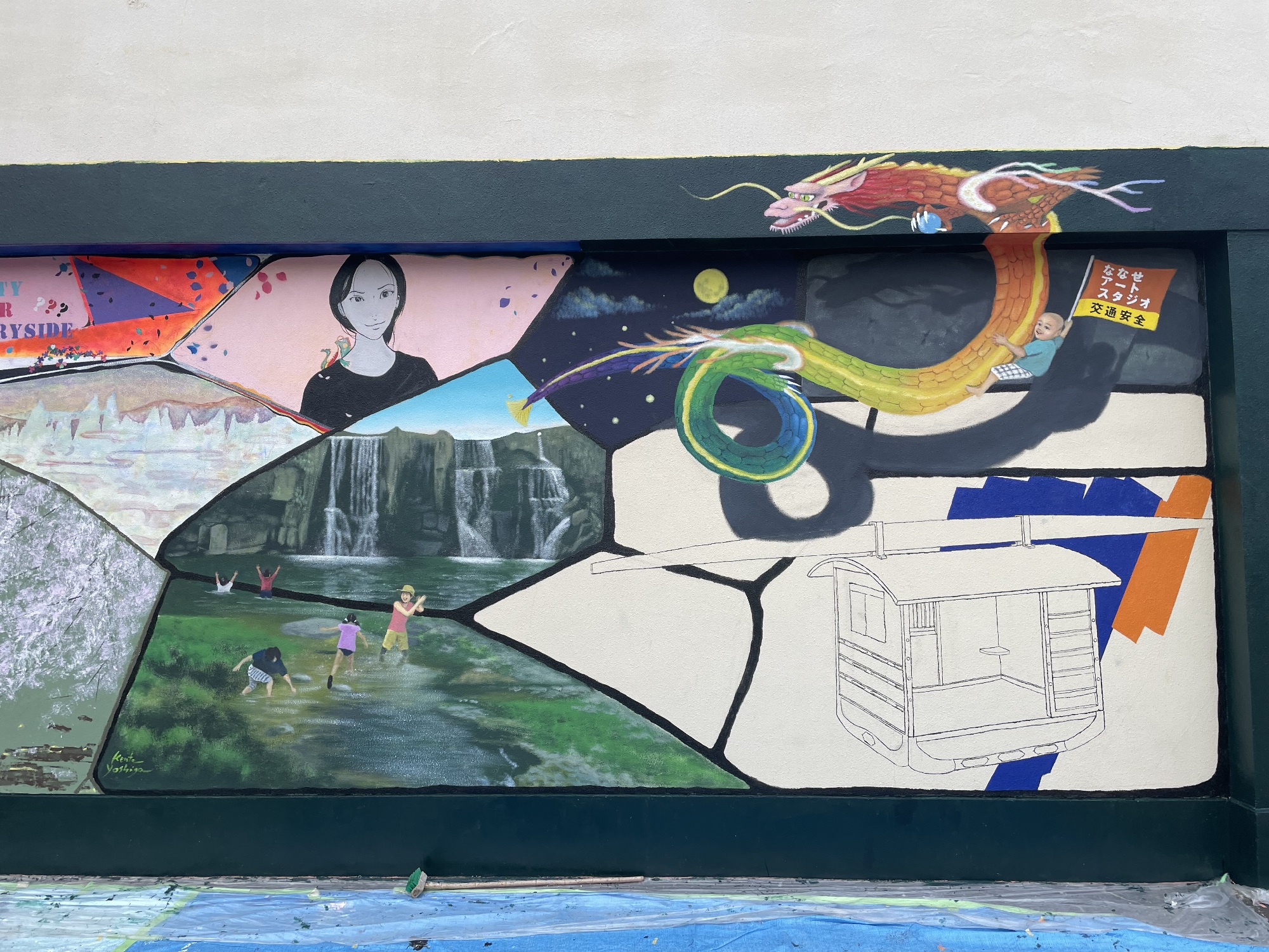 数年前に、野津原公民館に僕が龍を描いた時も、竹山さんは不思議なご縁も感じていたそうで、龍とカズサトくんをここで描くことになったのは必然だったのか、と思わされています。