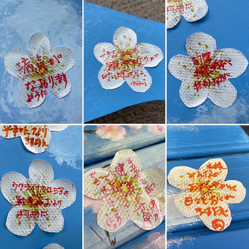 梅の花の絵のシールに願いを描いて貼ってもらう参加型作品に挑戦。