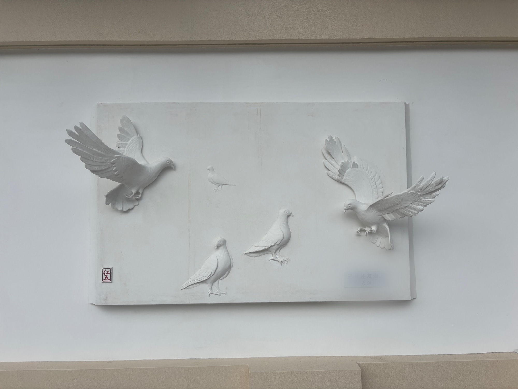 羽ばたく鳩、寄り添う鳩、それぞれの姿を漆喰の柔らかな質感で表現しました。