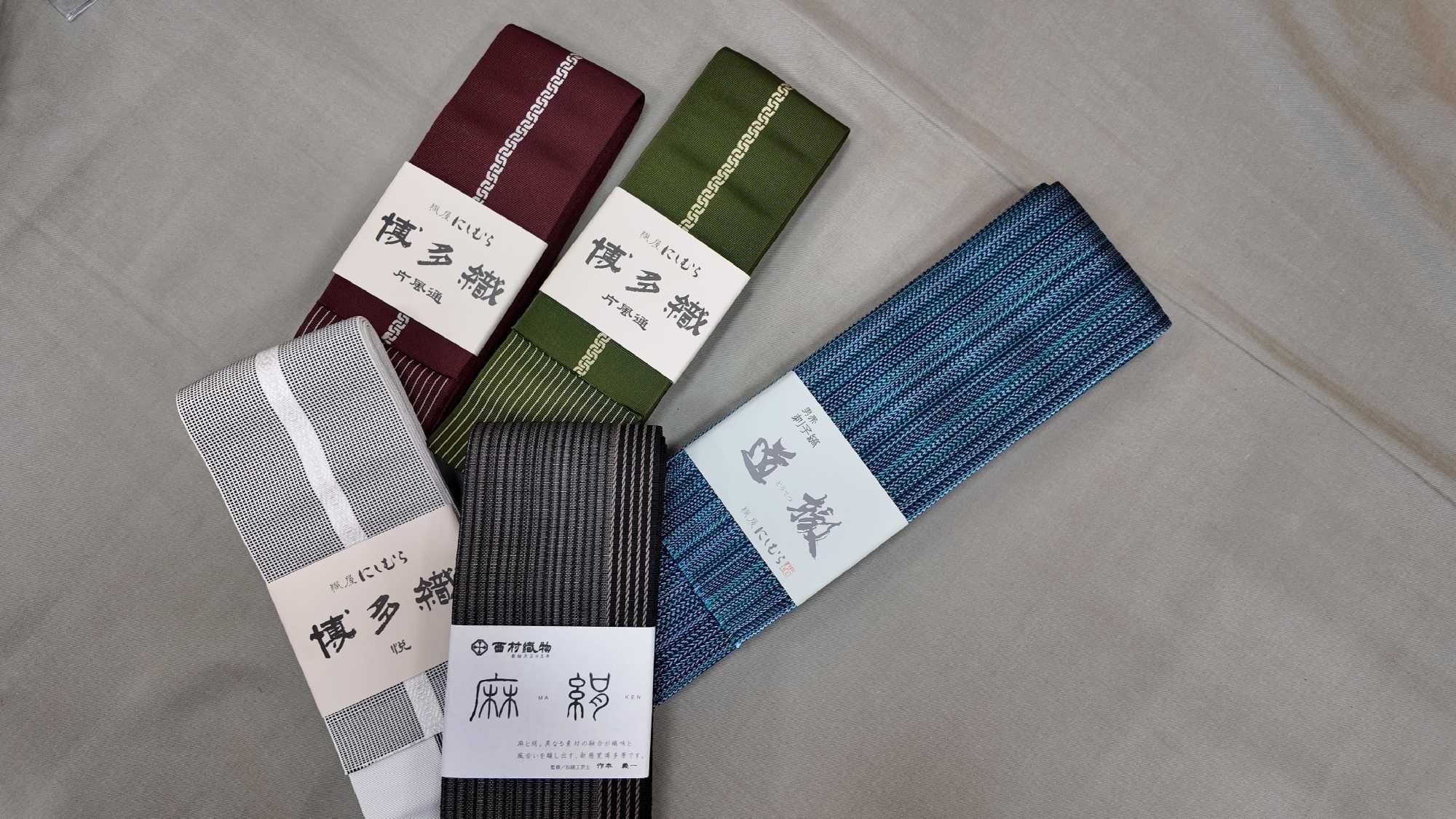 しっかりと織られた厚手の帯で、素材も絹・綿・化繊とさまざまです。