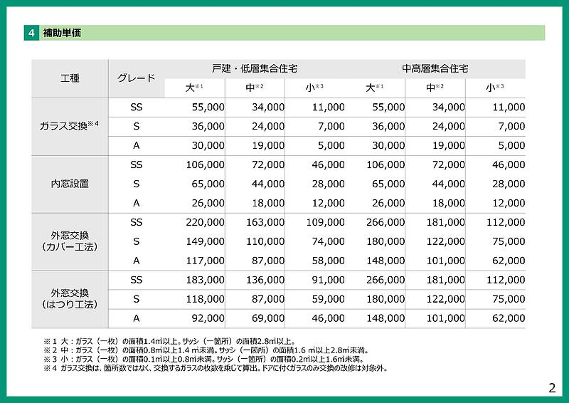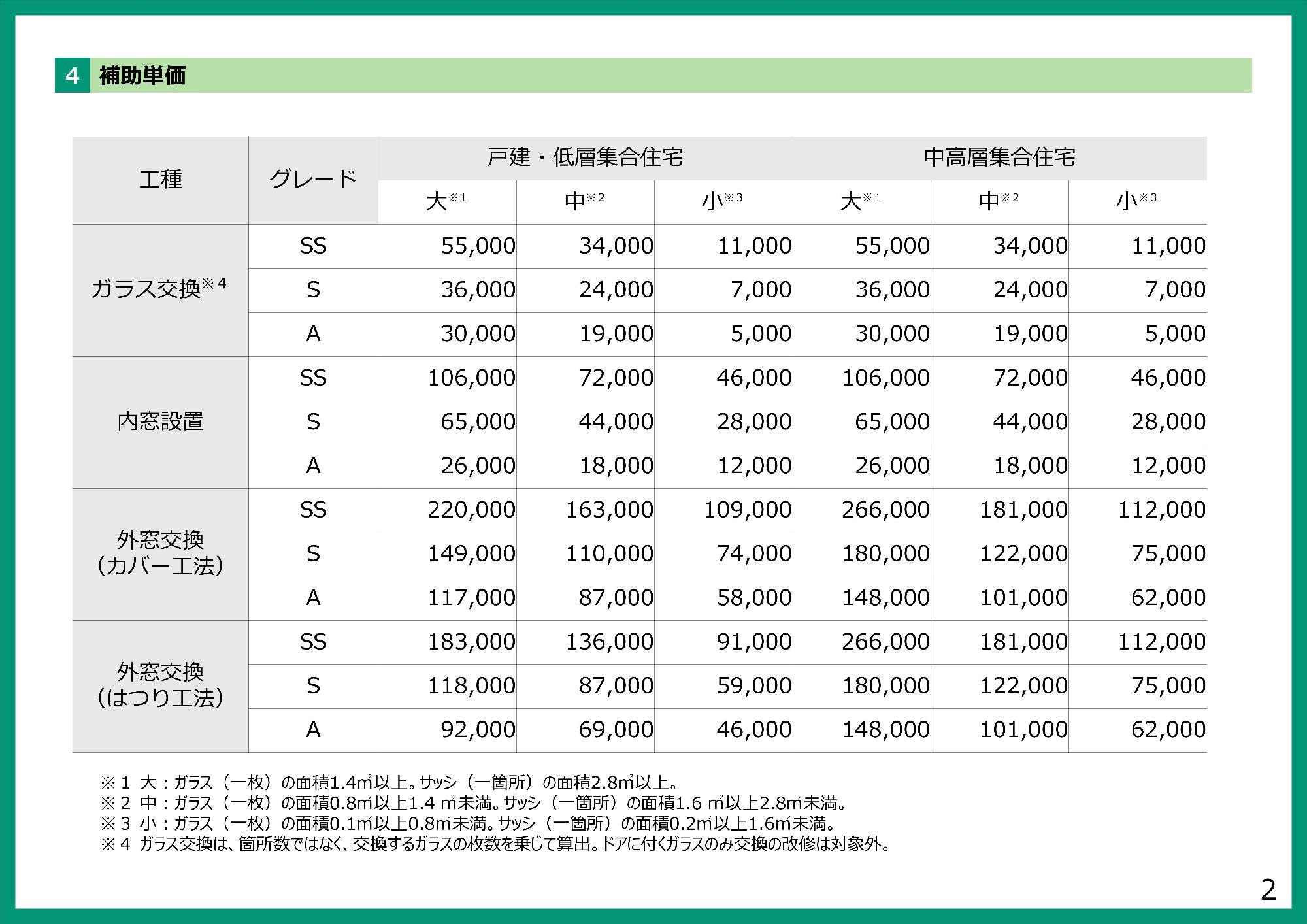 高い断熱性能を持つ窓への改修に関する費用の1/2相当等を定額補助(上限200万円)