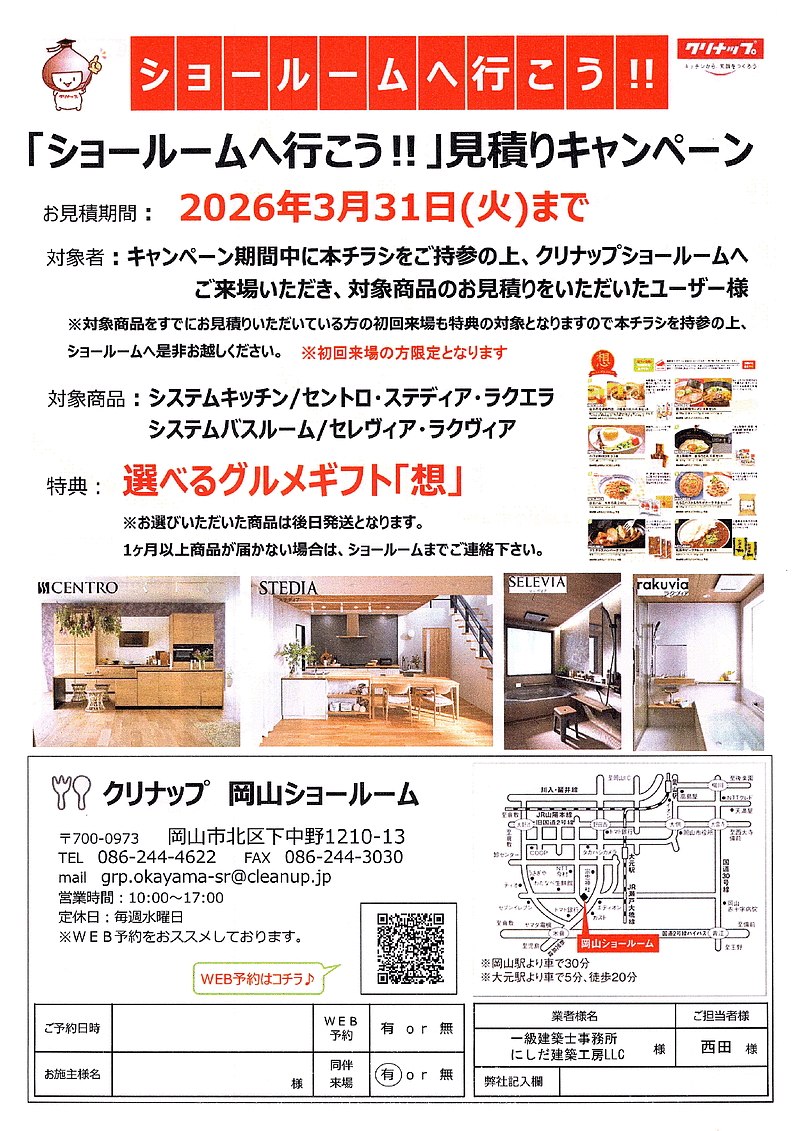 期間中にクリナップショールーム岡山(岡山市北区下中野)にて水廻りのお見積りを行っていただいた方に特典あり。