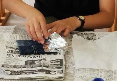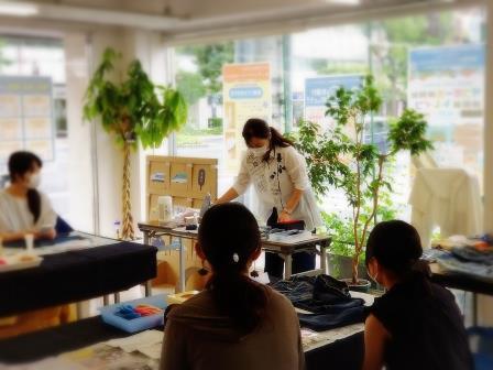 岡山と言えばやっぱり『デニム』。はかなくなったジーンズをリメイクする方法を、ワークショップでお伝えさせて頂きました。デニム生地はとっても丈夫です。縫い目のステッチや装飾の刺繍、ポケットやファスナー等もよく見れば、とっても可愛い。そんなジーンズをミシンや針・糸は使わなくても、特殊な糊とアイロンだけで、バックや小物アクセサリーなど様々な作品が制作できます。ボタンや毛糸等を装飾すれば、とってもエコな作品になりますね。『三密』にならないように、少人数の定員にして頂き、距離を気にしながらご指導させて頂きました。