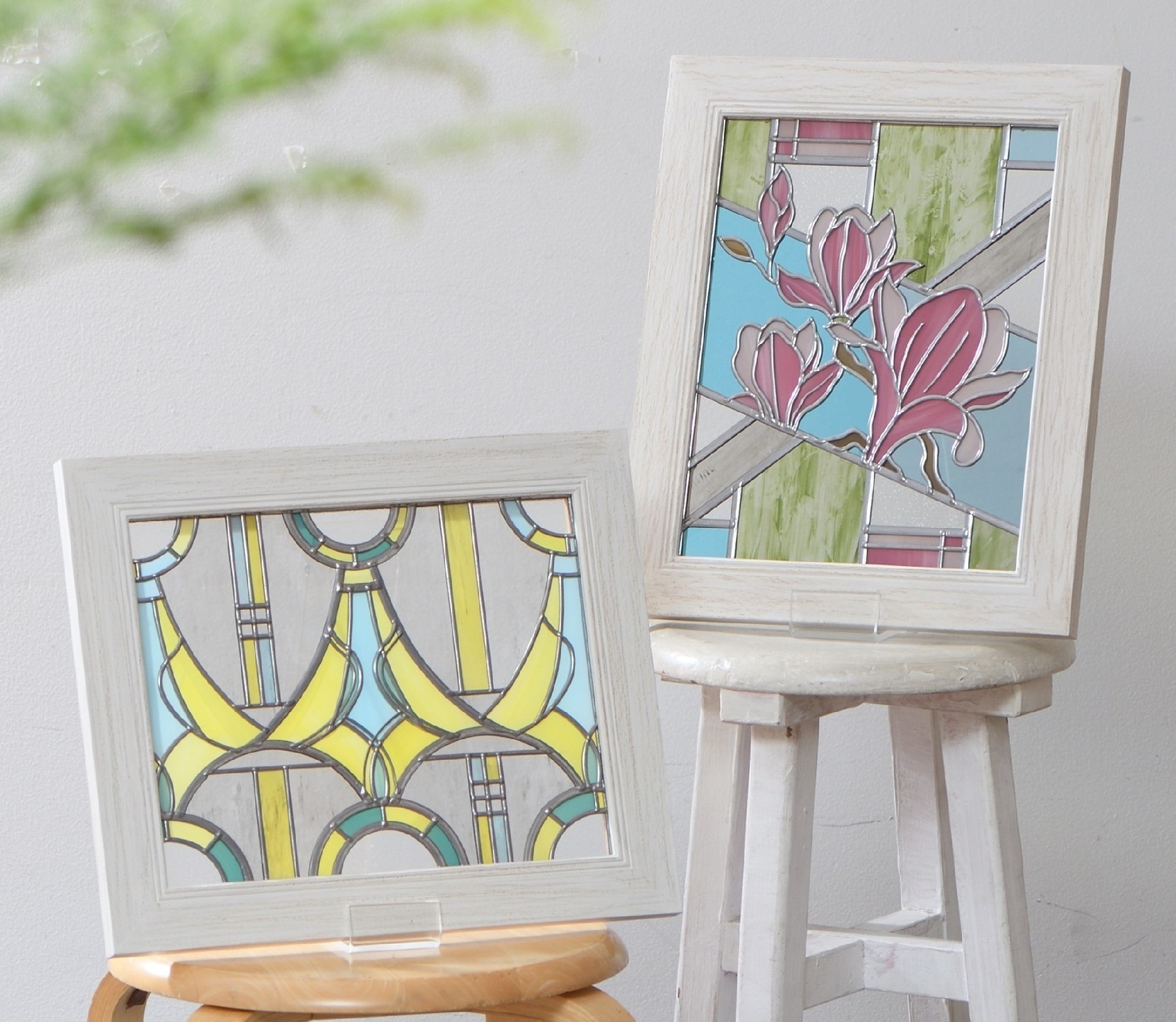 グラスアートは一枚のガラスに接着剤付きのリード(鉛)線と日焼けしにくい特殊フィルムを貼って作品を作ります。どなたでも、お手軽にステンドグラス風の作品が作れます。ステンドグラスに比べて、ガラスを直接カットしたりすることはないので,手軽に短時間ででき、安全に作ることができるのが特徴です。また、さまざまな楽しみ方があります。リード線やフィルムはガラスだけでなく 鏡、アクリルや木製など、平らなところであればどこにでも貼ることができます。小さなガラスケースの小物雑貨から、窓ガラスのインテリアにいたるまで、楽しみ方がひろがります。お子さまからご年配の方まで幅広い年齢層の方にお楽しみいただけます。