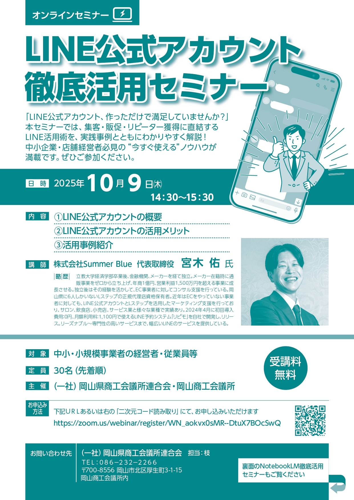 岡山商工会議所からご依頼いただき、来月、岡山県商工会議所連合会および岡山商工会議所が共同主催するLINEのオンラインセミナーで、講師を務めさせていただきます。