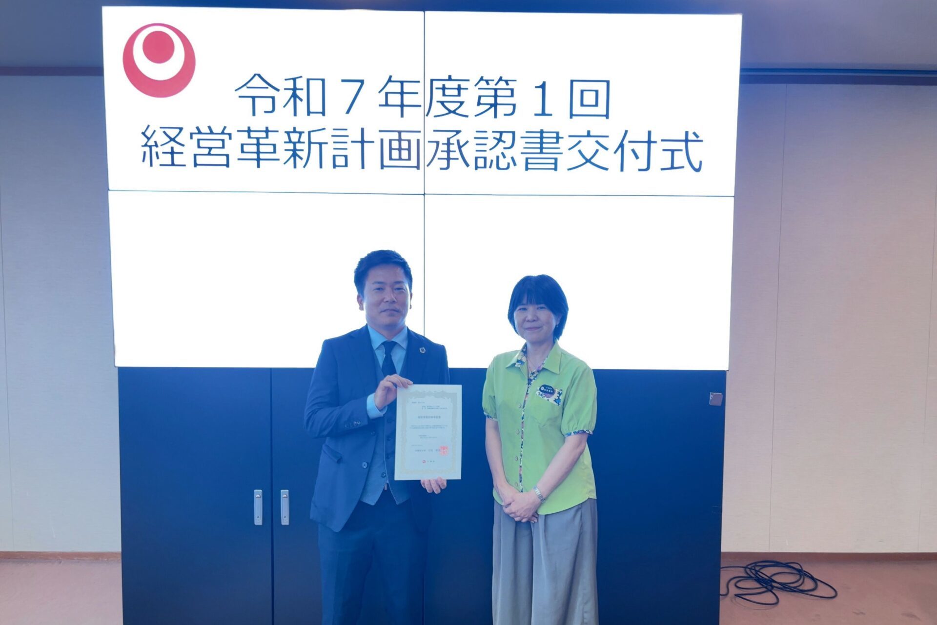 沖縄県が進める経営革新計画の承認を受け、沖縄県商工労働部長の知念百代様より承認書を授与されました。