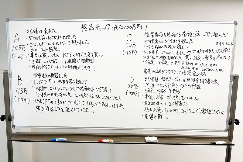 ホワイトボードには各受講生のこれまでの振り返りをまとめて、受講生は同じ内容を学習した他の受講生が、どんな取引をしてどんな結果になったのかを肌で感じることができます。