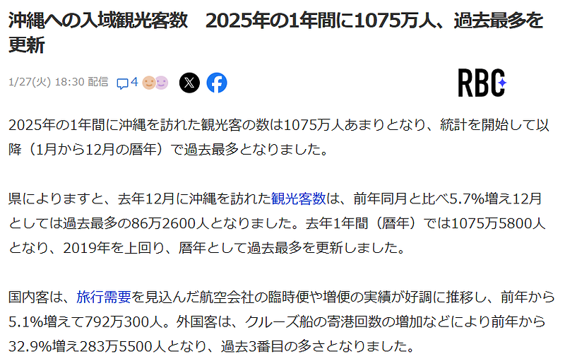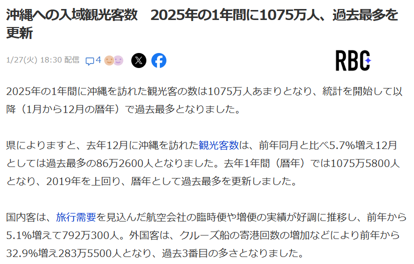 昨日、沖縄観光にとって大きなニュースが飛び込んできました。2025年の入域観光客数が1,075万人を超え、過去最多を更新したとのこと。