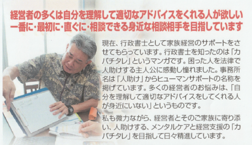 資格と前職での経験、これまでの実績を最大限に活かし、「会社と家族の相談相手」として、経営・メンタルケア・終活を応援、サポートします。お客さまにとって何でも話せる気軽で身近な相談相手を目指しています。