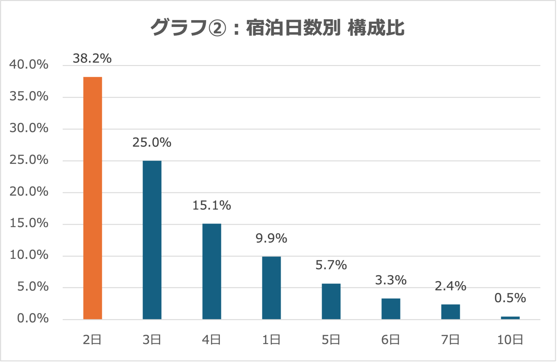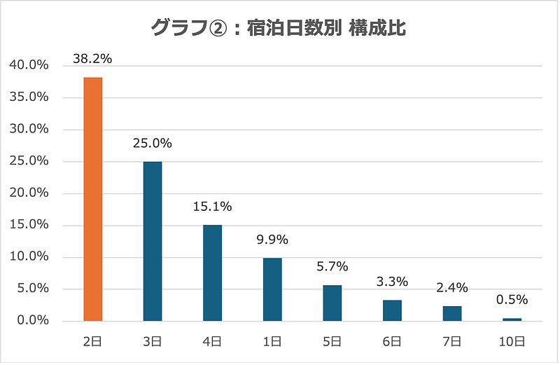 続いて宿泊日数の分布を見てみましょう。最も多かったのは「2泊」で全体の38%、次いで「3泊」が25%、「4泊」が15%と続きました。1泊のみの利用は10%にとどまり、5泊以上の長期滞在は全体の1割強に過ぎません。つまり、南城市における宿泊スタイルは圧倒的に「2〜3泊の観光拠点利用」が主流だったのです。