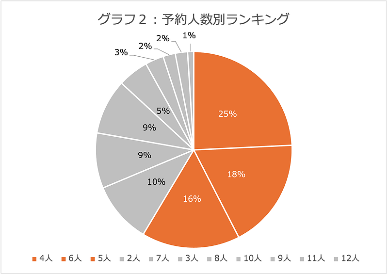 では、なぜ幅広い価格帯で予約が成立していたのでしょうか。その背景を理解する鍵が、予約人数別の分布にあります。最多は「4人」25%、「6人」18%、「5人」16%で、この3カテゴリだけで全体の約6割を占めていました。つまり、予約の中心は「4〜6人の中規模グループ」であり、この人数帯が価格の中心値ともリンクしていたのです。