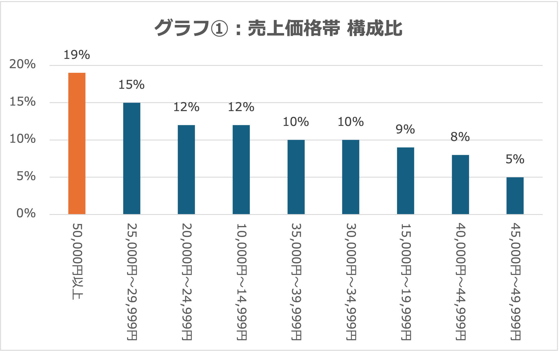 売上データを見直すと、価格帯は1万円台から5万円以上まで幅広く分布していました。最も多かったのは「50,000円以上」で全体の19%、次いで「25,000〜29,999円」が15%、「20,000〜24,999円」と「10,000〜14,999円」がそれぞれ12%と続きます。つまり、この物件は「低価格帯に偏るタイプ」ではなく、高価格帯の予約も一定数獲得できていたことがわかります。