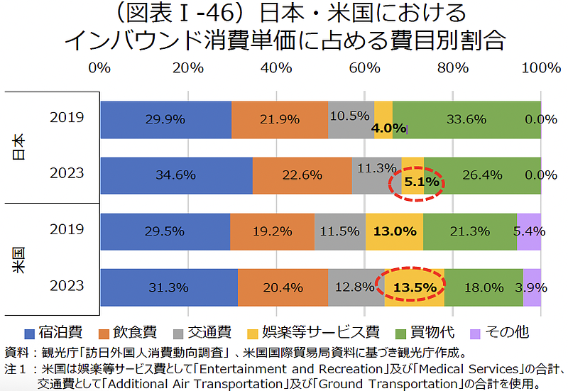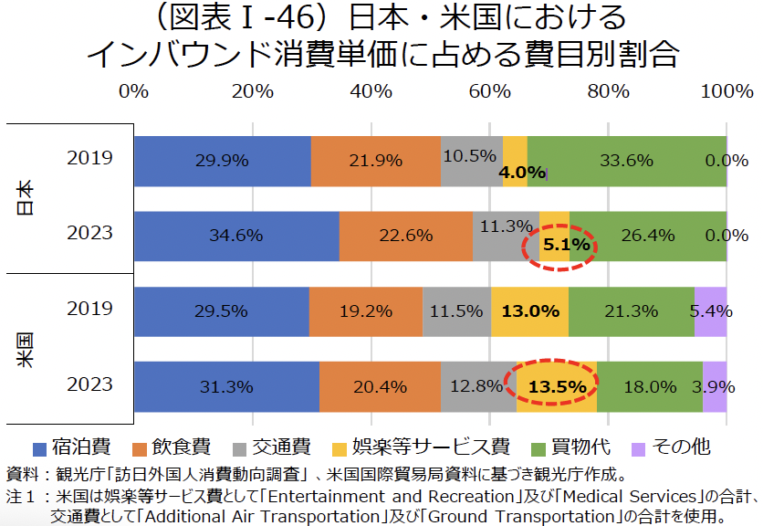 項目別に見ると、2023年の日本におけるインバウンド消費単価の内訳は、宿泊費34.6%が最多で、次いで買物代26.4%、飲食費22.6%、交通費11.3%、娯楽等サービス費5.1%です。2019年比では宿泊費が+4.7pt、買物代が-7.2pt、娯楽等サービス費が+1.1ptと推移しています。参考までに米国の2023年は娯楽等サービス費が13.5%と日本の約2.6倍で、体験消費の伸びしろが日本には依然大きいと言えます。