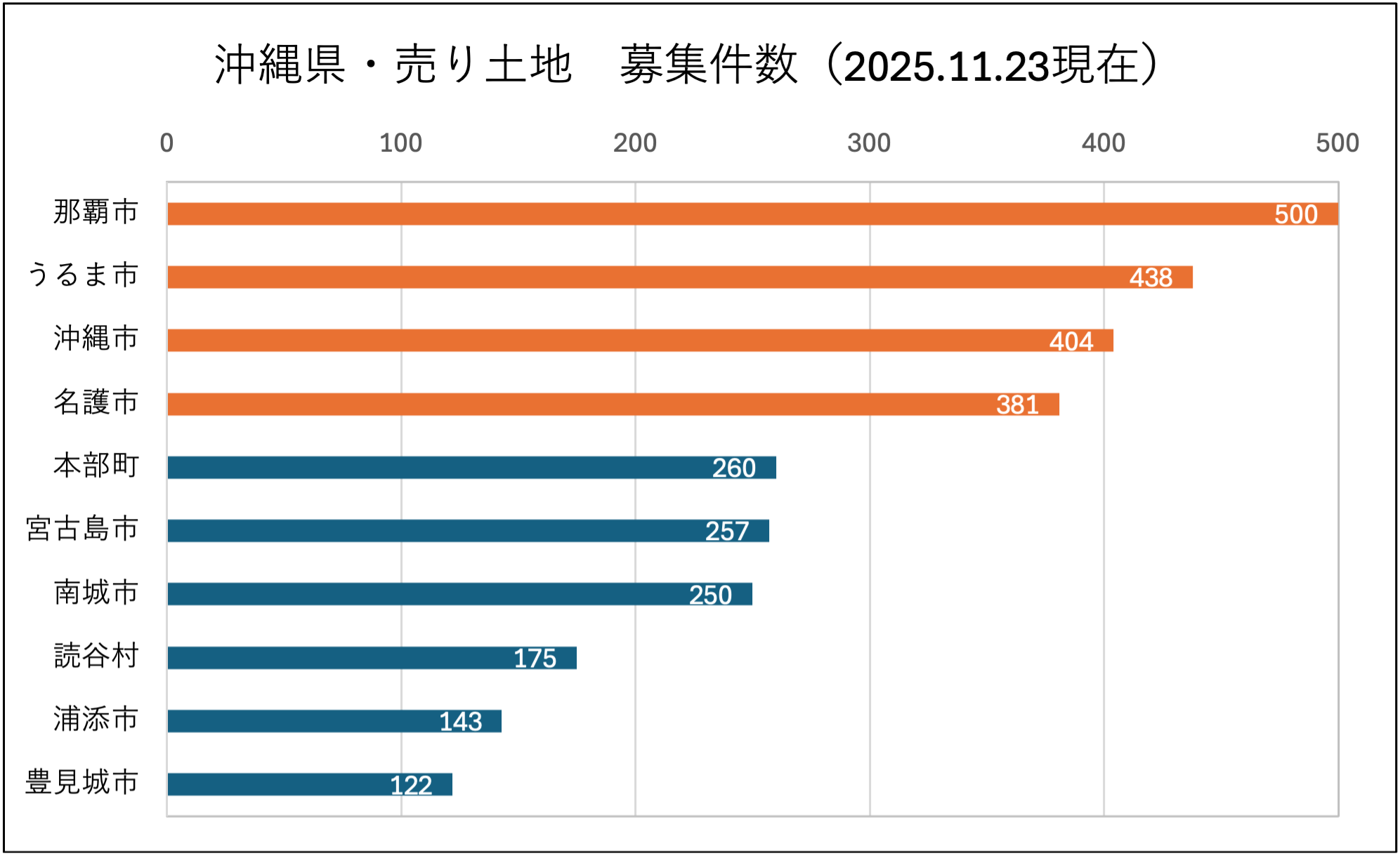 参考までに「うちなーらいふ(沖縄の募集サイト)」で沖縄県内の売り土地を調べたところ、約4,500件の募集情報があり、仮に売買価格を1件1,000万円で見積もれば、その規模は450億円にも達します。※市町村別販売件数トップ10です。