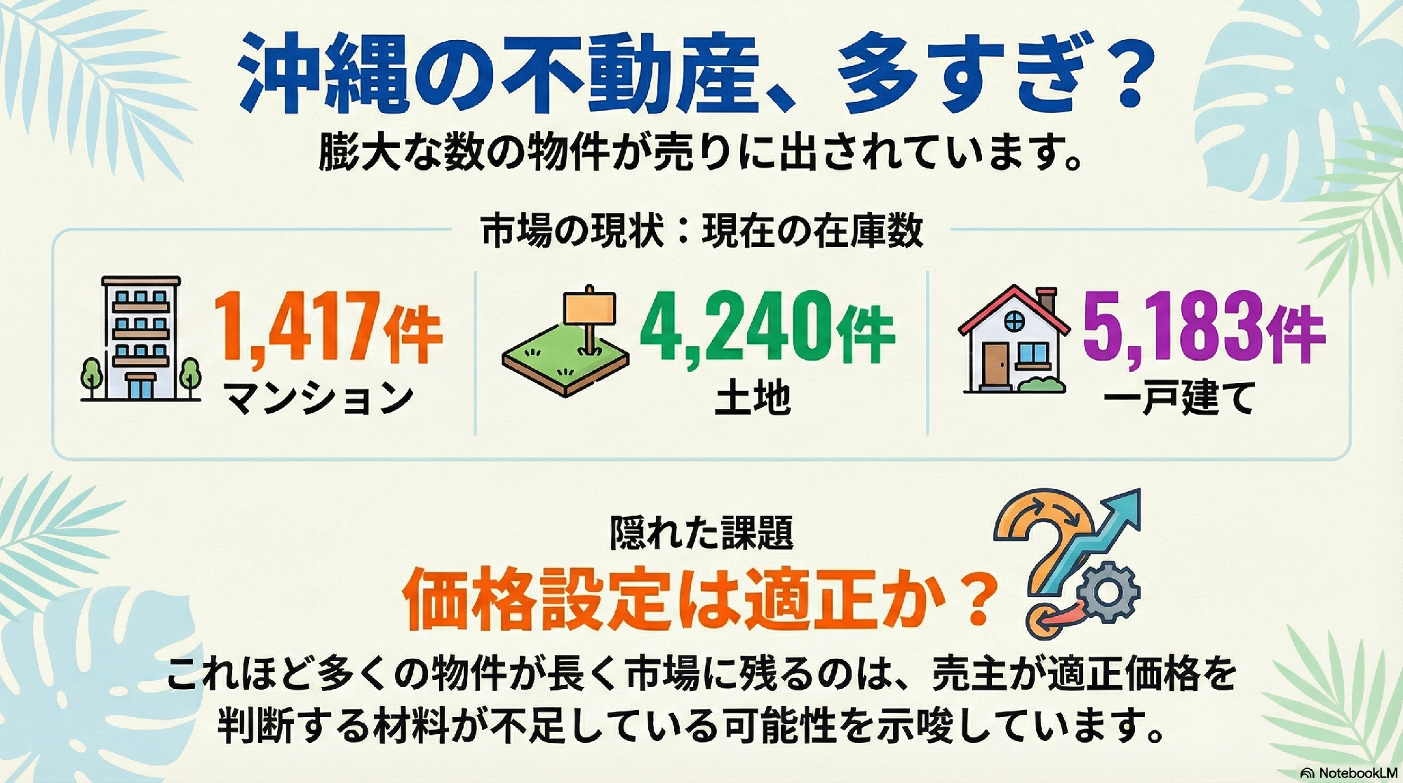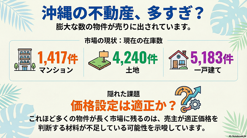ちなみに、これは本日現在、沖縄最大の不動産ポータルサイト「うちなーらいふ」に掲載されている売買物件数です。マンションが1,417件、土地が4,240件、一戸建てが5,183件と、市場には相当数の物件が出ています。掲載数はそのまま在庫数とも読み取れますが、もし適正な価格で募集されているのであれば、これほど多くの物件が長期間掲載され続けるものだろうかと感じることもあります。もちろん需給のバランスや時期的な要因、物件ごとの事情によって結果は変わるため、一概には言えません。ただ、売主様が判断するための材料が十分でないことが、その背景にあるのではないかと考える場面が少なくありません。