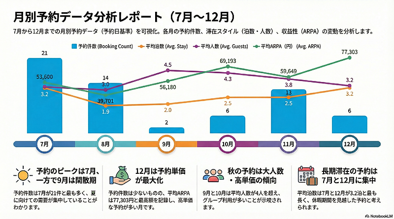 こうして7月から12月までの動きを一つずつ見ていくと、「予約件数が多い月=良い月」「予約が少ない月=悪い月」と単純に切り分けられるものではないことが、数字からはっきりと分かります。実際には、初動で件数を取りにいった7月、価格と日数を抑えた8月、一見すると静かに見える9月、条件を整えた10月、リスティング改善が効き始めた11月、そして単価と滞在日数が最大化した12月と、それぞれの月が異なる役割を持ちながら積み重なっている印象です。