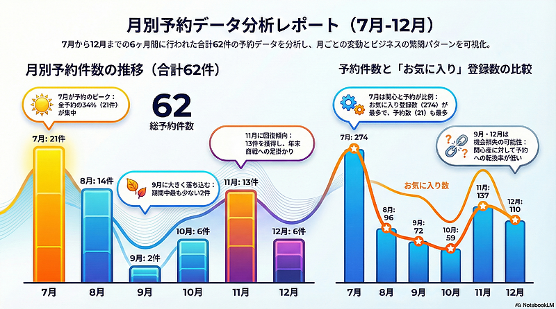また、お気に入り登録数が6ヶ月で748件まで積み上がっている点も見逃せません。これは必ずしも即予約に結びついた数ではありませんが、「比較検討の土俵に乗っていたゲスト」が一定数存在していたことを示しています。特に7月や11月のようにお気に入り数が伸びた月は、露出や訴求内容がうまく機能していた可能性が高く、予約件数だけでは測れない“関心の蓄積”が進んでいたと考えられます。