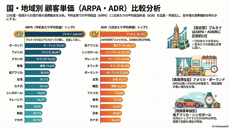 一方で、南アフリカやシンガポールは、ADRがトップクラスに高い反面、ARPAは中位にとどまっており、短期滞在であっても単価の高い日程を選び、効率よく滞在するタイプのゲスト像を想起させます。
