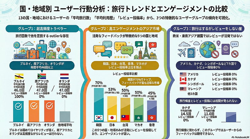 その一方で、アメリカやカナダ、シンガポール、マレーシアといった国々は、平均旅行回数や利用歴を見る限り、決して旅行頻度が低いわけではありませんが、レビュー投稿率は0%となっています。これは「満足度が低かったから書かない」というよりも、「そもそもレビューを書く文化がない」「書く必要性を感じていない」という行動特性によるものと考える方が自然です。レビュー数だけをKPIとして見てしまうと、こうした層の評価を過小に見積もってしまうリスクがあるという点は、数字を扱う上で常に意識しておく必要があります。