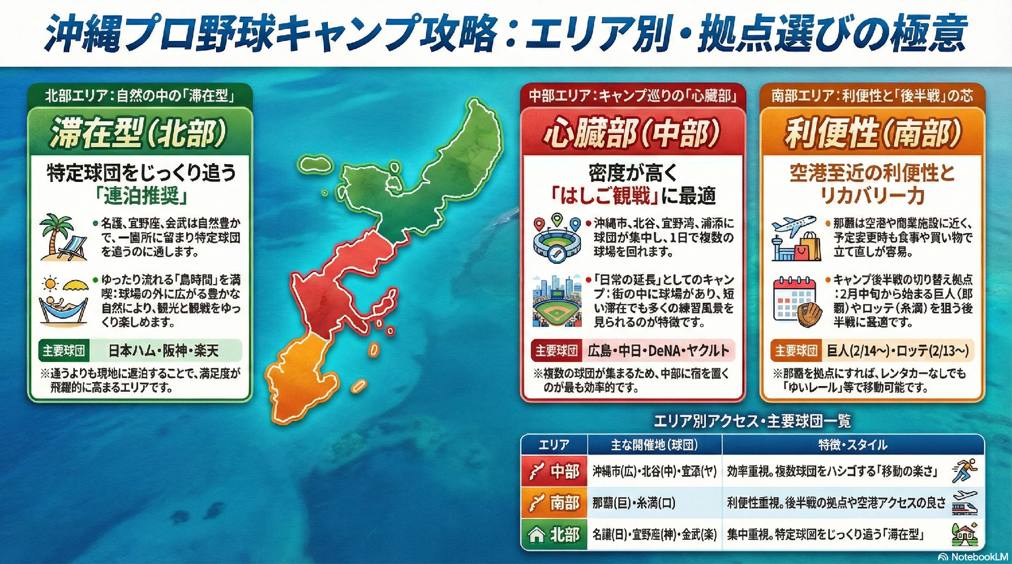 沖縄のキャンプ地を効率よく巡るなら、球場を点で追うより、エリアで考える方がラクです。島は南北に長く、同じ「沖縄」でも移動の体感が変わります。