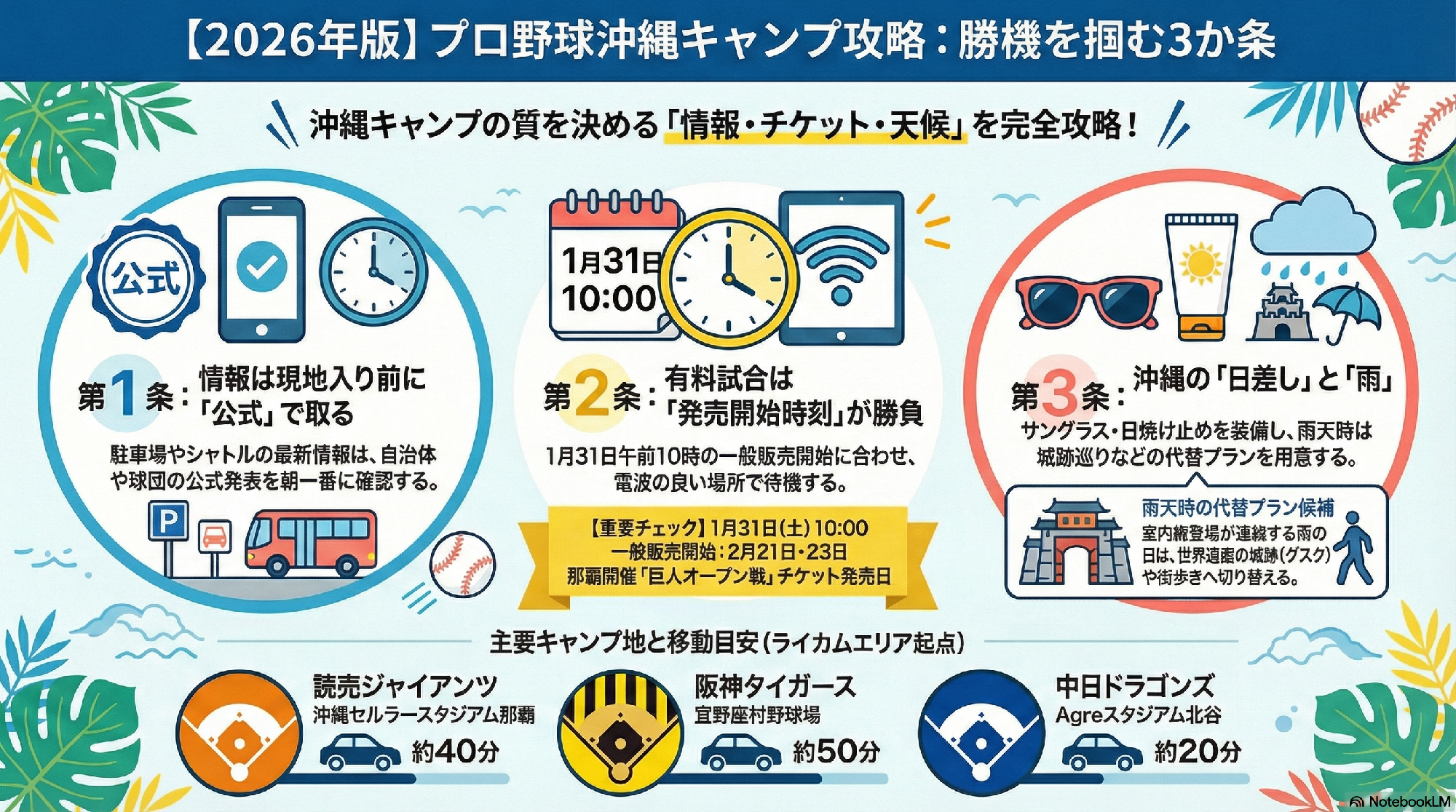2026年の沖縄キャンプは、2月1日の日曜日から島の熱が上がり、途中で国際戦の緊張が混ざり、那覇組が入ってもう一段動くため、最初から最後まで全力で走る必要はありません。前半を中部で味わい、後半を那覇で締め、北部に泊まって深く追いかける。自分の性格に合わせて、強弱をつけると楽になります。
