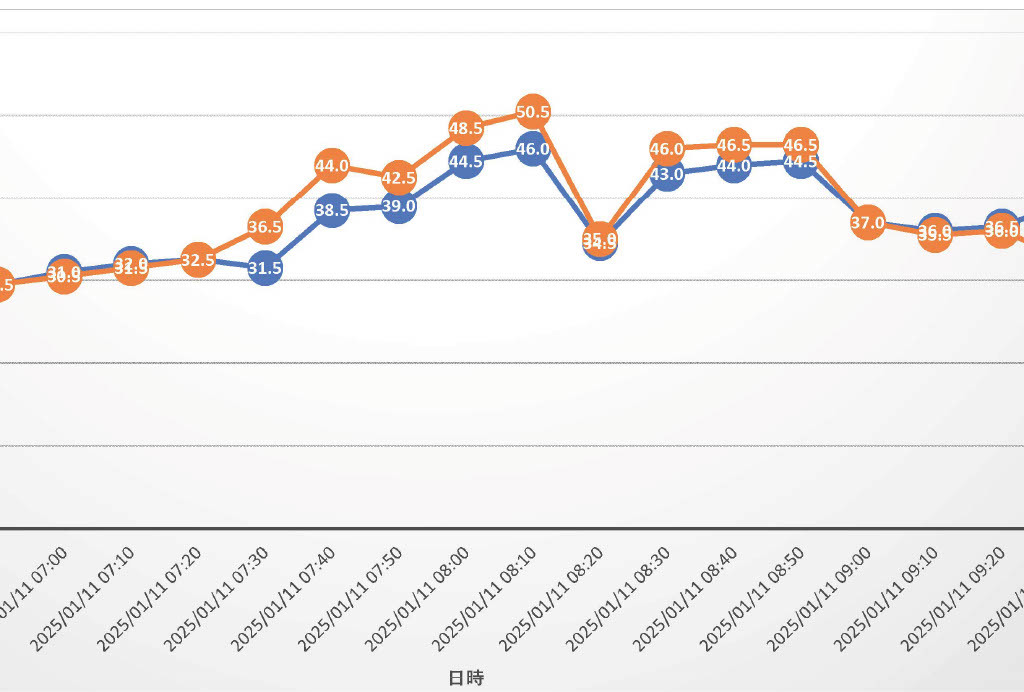 上の写真のように通常のガラスと遮熱コーティングしたガラスの前に、一定時間ごとに温度を測定する「データロガー」を置いてグラフを作成しました。下のグラフですが、外気温が高いときは4℃~5℃の温度差がありました。