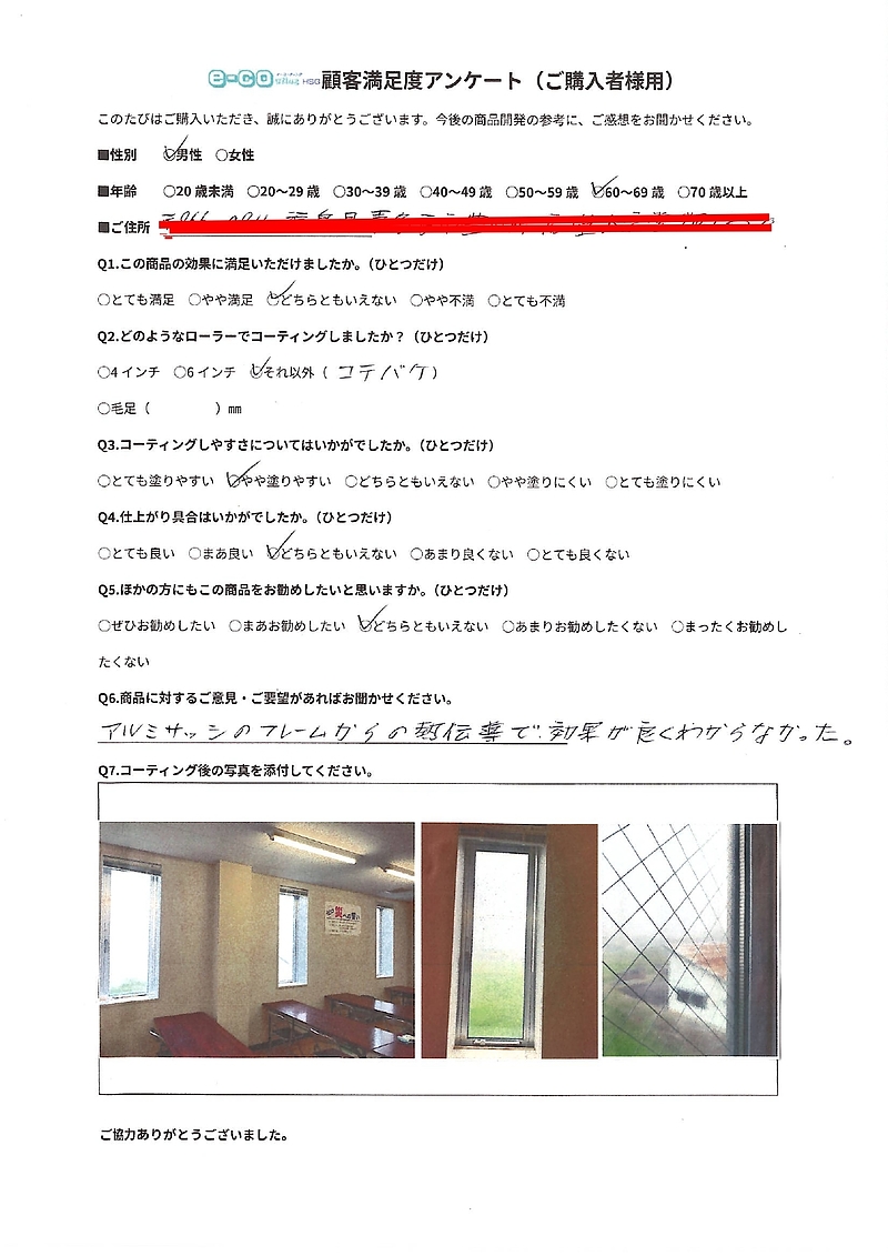 こちらのお客様は小窓の型板ガラスへ施工していただいたようです。アルミサッシからの熱伝導に触れられてることから、おそらく冬季の結露のことだと思います。ガラス面に遮熱コーティングを施工されてもアルミサッシは変わらず結露致します。そのあたりで効果が分かりにくいとのご指摘だと思います。今後はそのことも含めて細かくご説明し、アルミサッシに張り付ける結露防止シートなどもご紹介できたらと考えております。