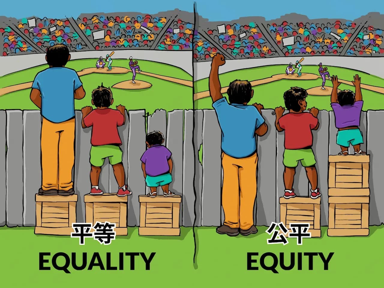 平等は、各人に同じ支援(この場合は同じ高さの箱)を提供することです。公平は、個人に合わせた支援を提供することです。