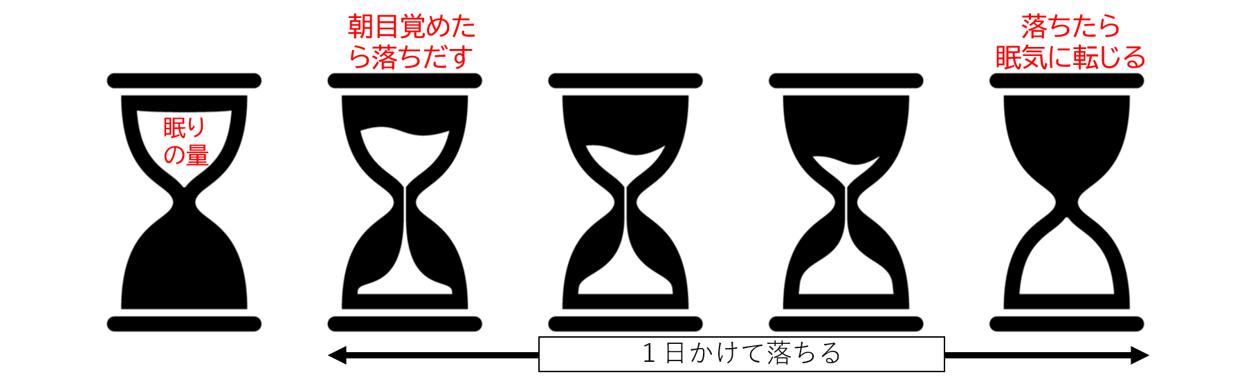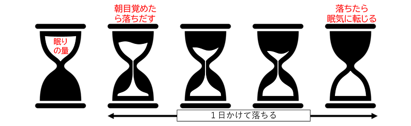 朝になっても砂が落ちきらず、前日の眠気がリセットされないまま残ってしまうのです。