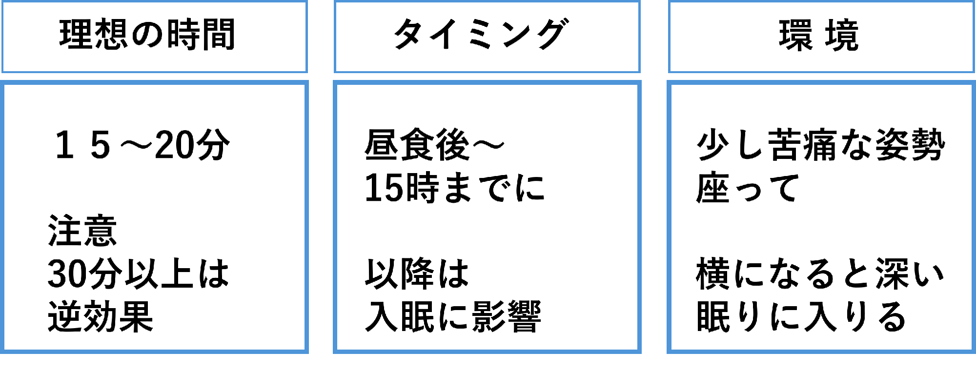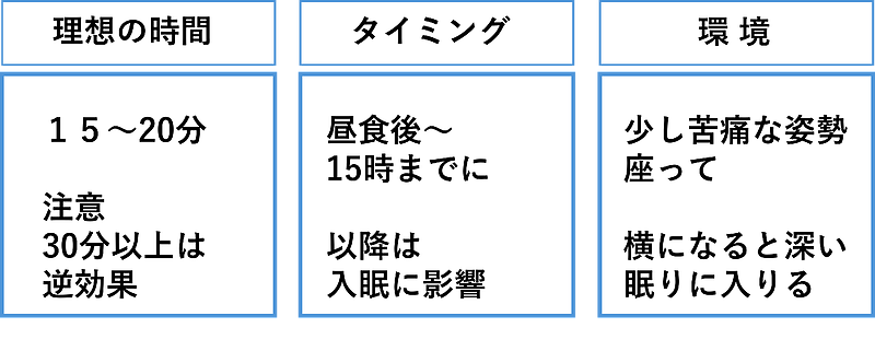 注意点は、30分以上寝ると深い睡眠に入り、従来のパフォーマンスに戻すのに時間を要します。
