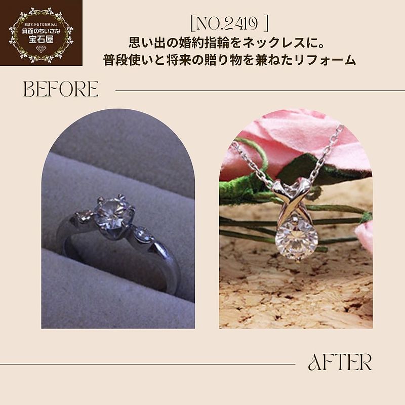 大阪市内からご家族3人でお越しのお客様が、婚約指輪をネックレスにリフォームしたいとのご相談にいらっしゃいました。