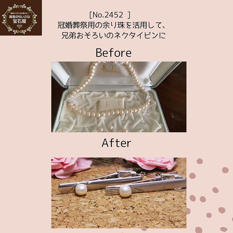 ご依頼主様は20歳の記念にお母様から贈られたパールのネックレスをお持ちで、その余り珠を使い、ご結婚を控えた長男さんと次男さんにネクタイピンを作りたいとのご希望でした。